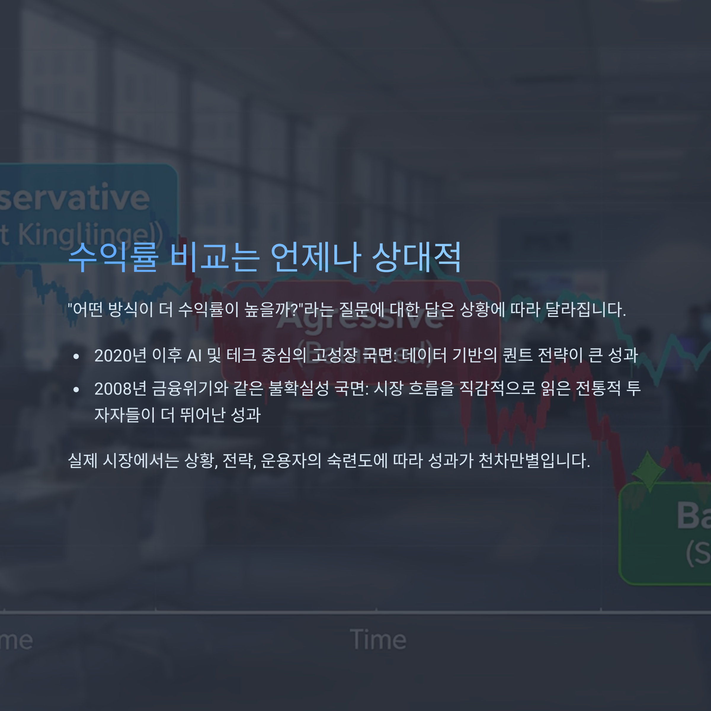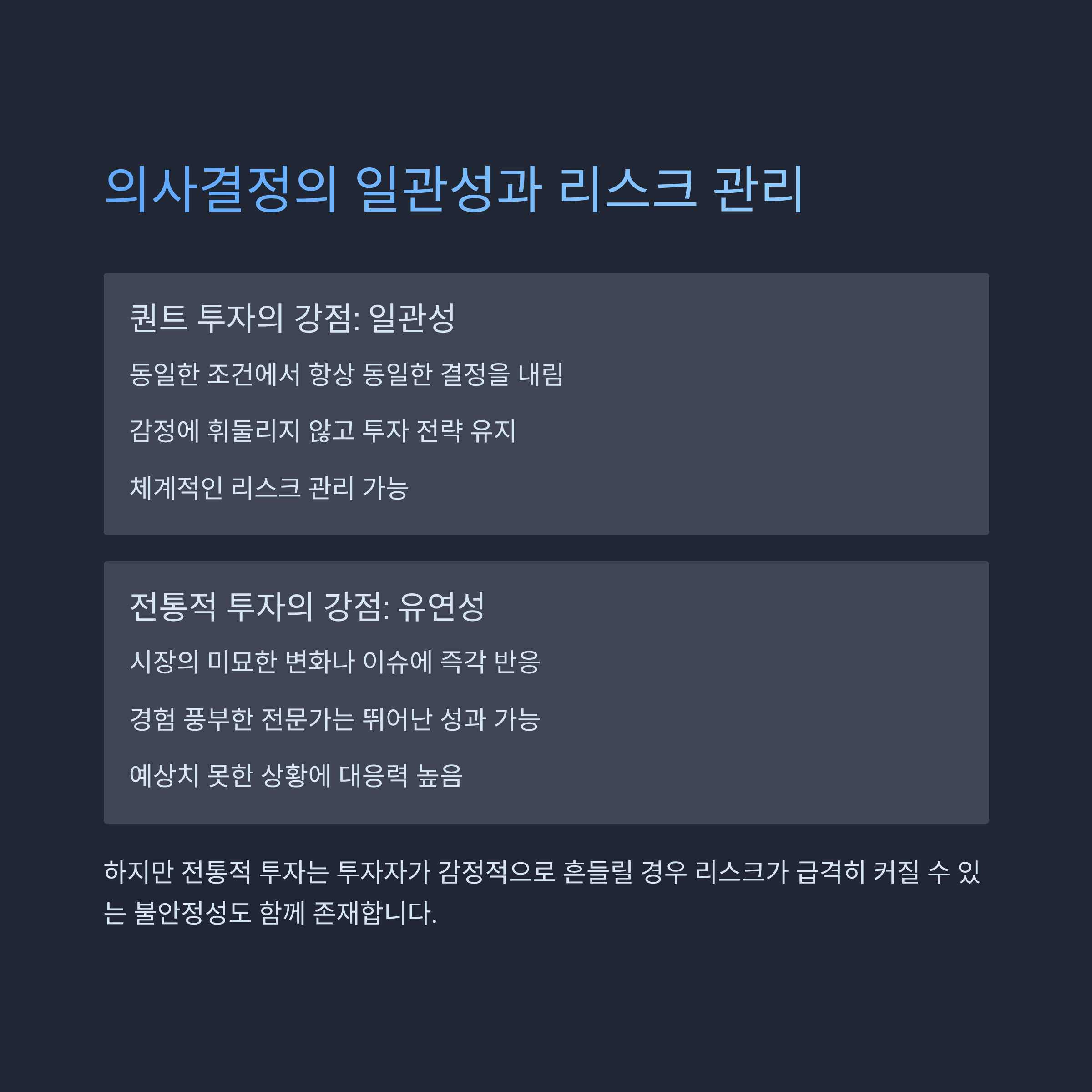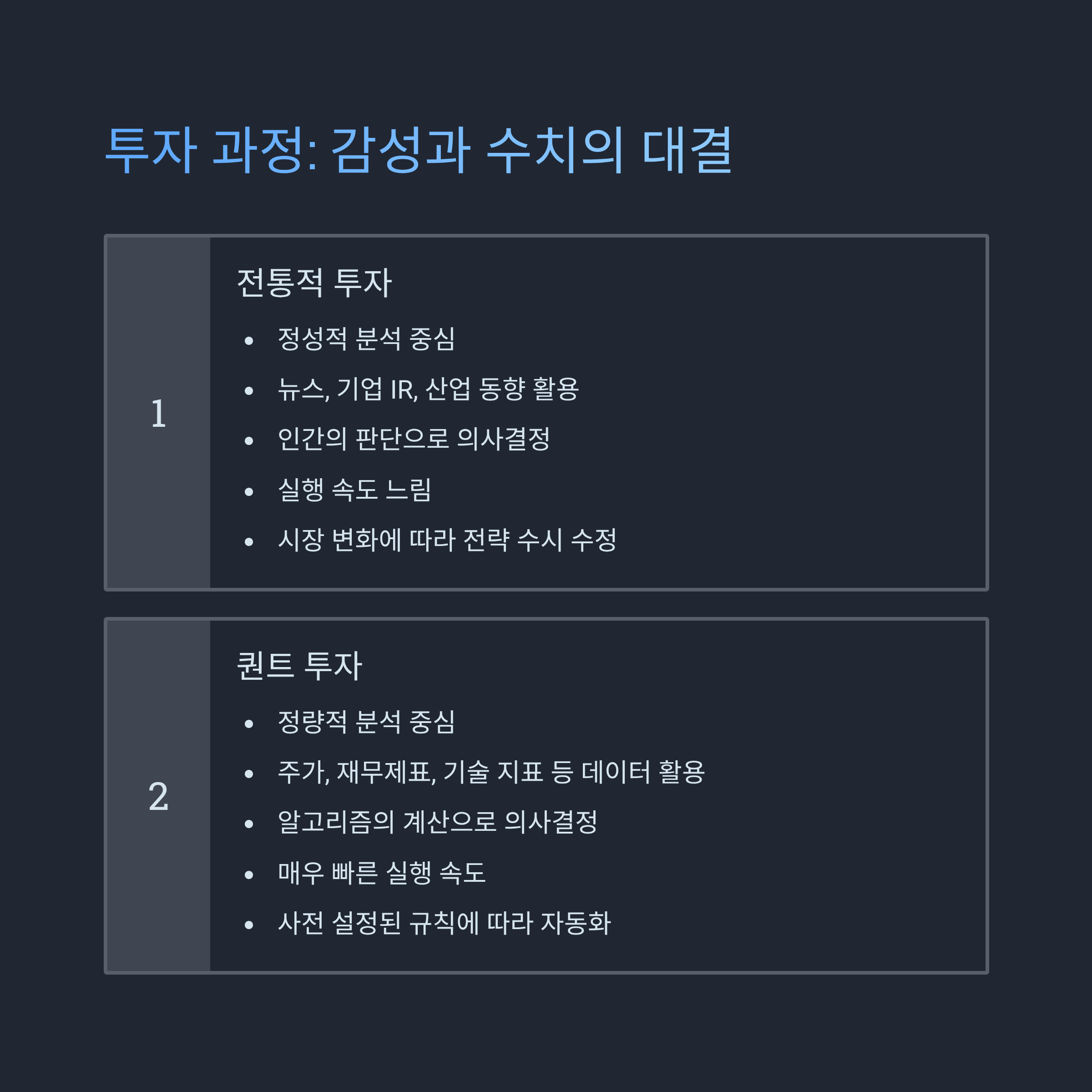 | 항목 | 전통적 투자 | 퀀트 투자 |