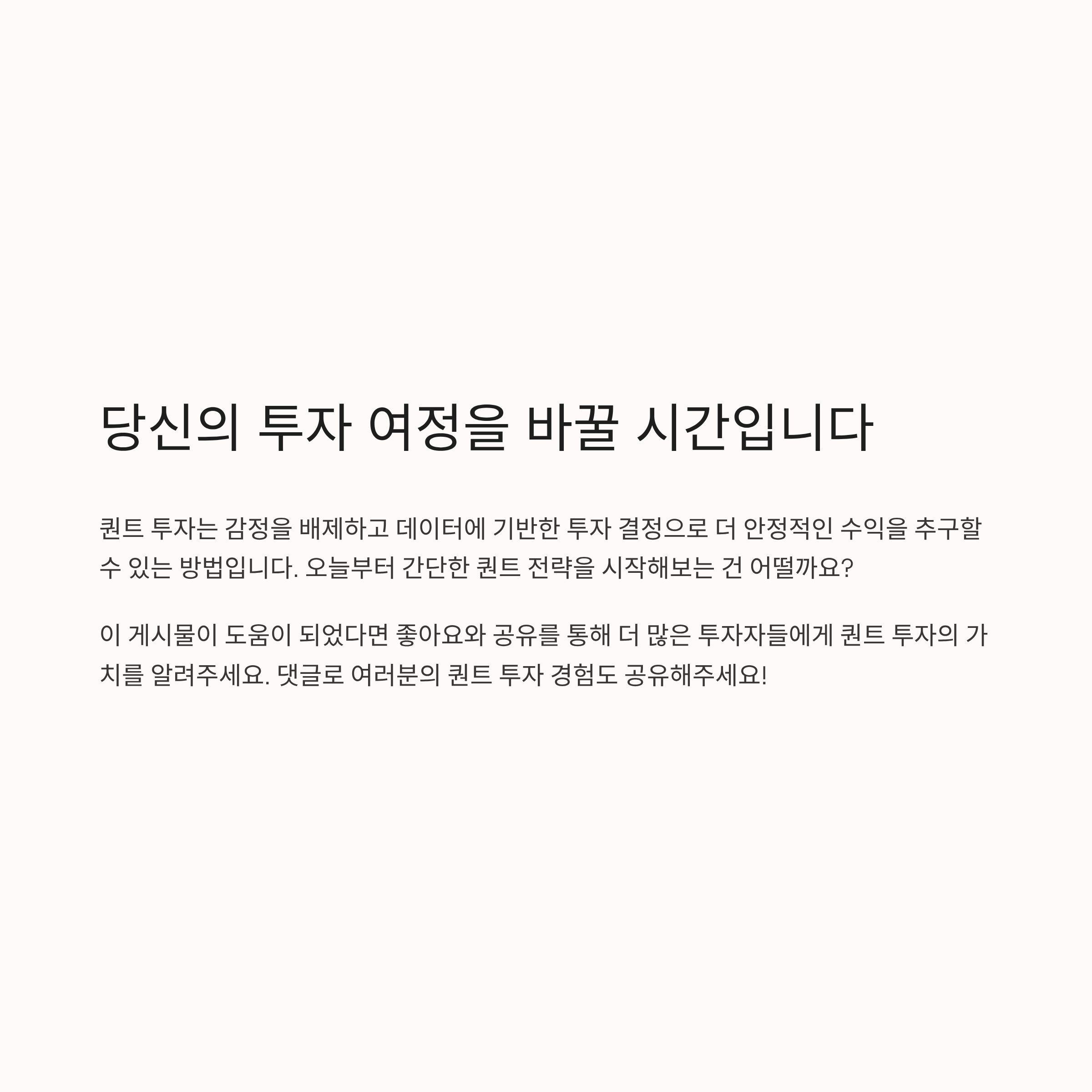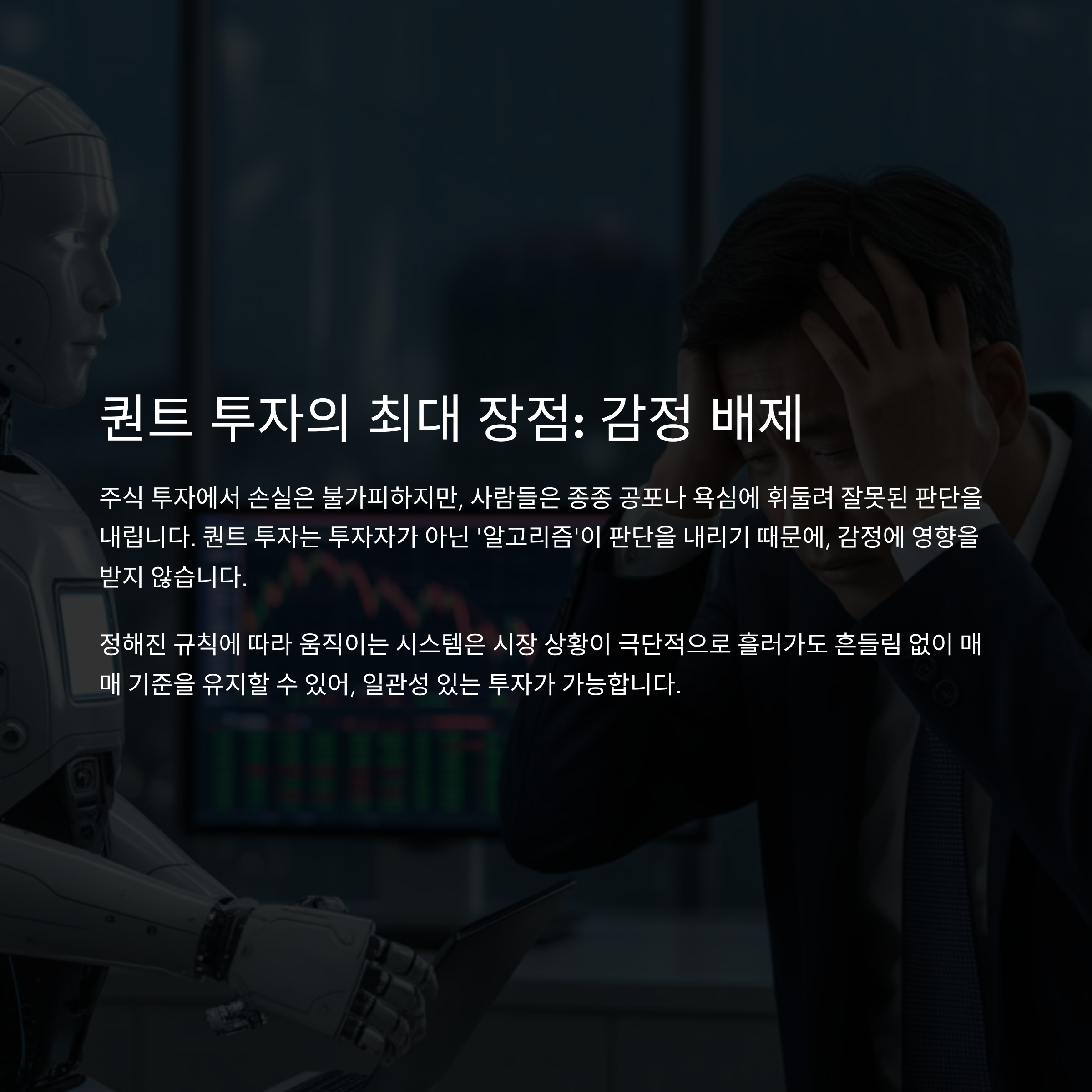하지만 퀀트 투자는 투자자가 아닌 '알고리즘'이 판단을 내리기 때문에, 감정에 영향을 받지 않습니다.
