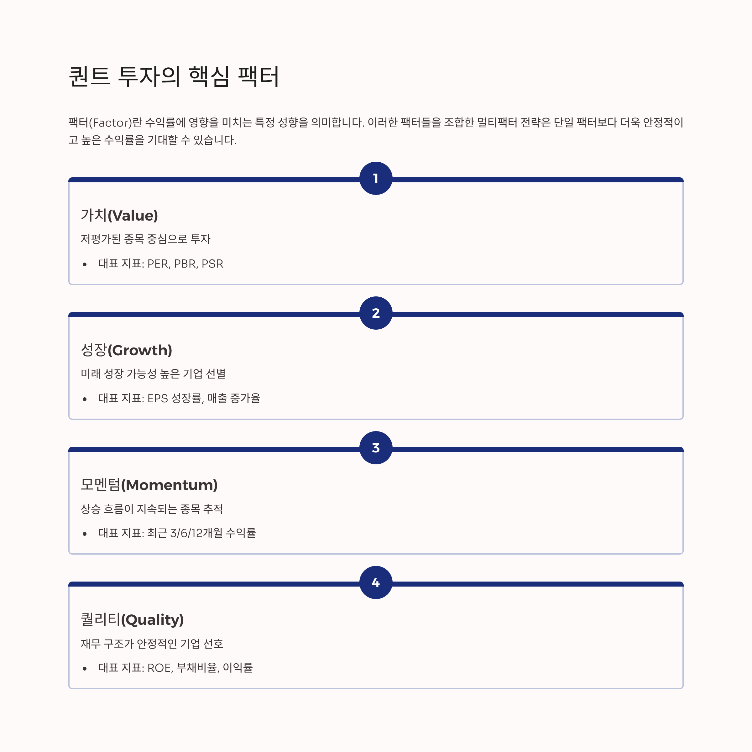 | 퀄리티(Quality) | 재무 구조가 안정적인 기업 | ROE, 부채비율, 이익률 |