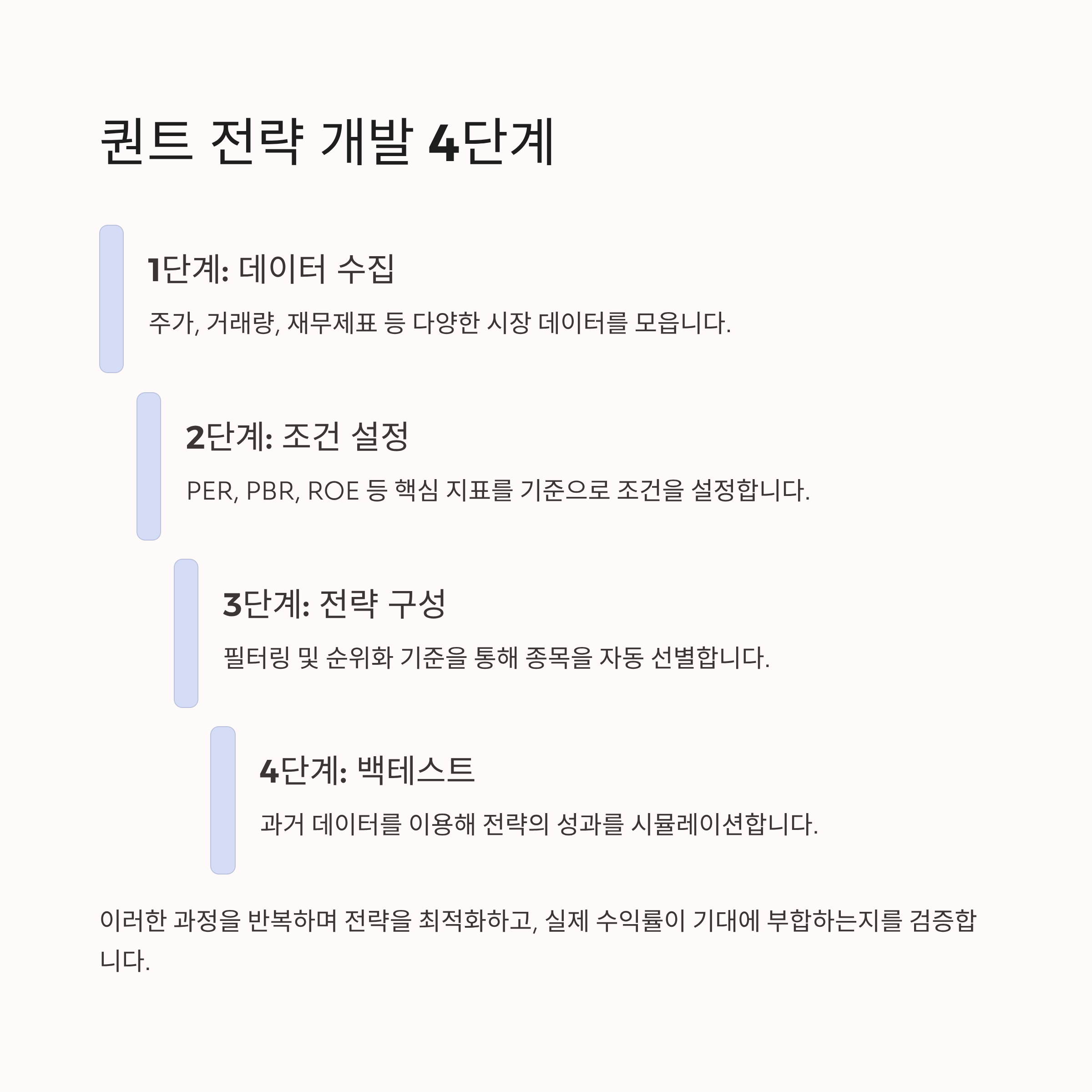 퀀트 전략은 대체로 다음과 같은 4단계를 거쳐 개발됩니다.